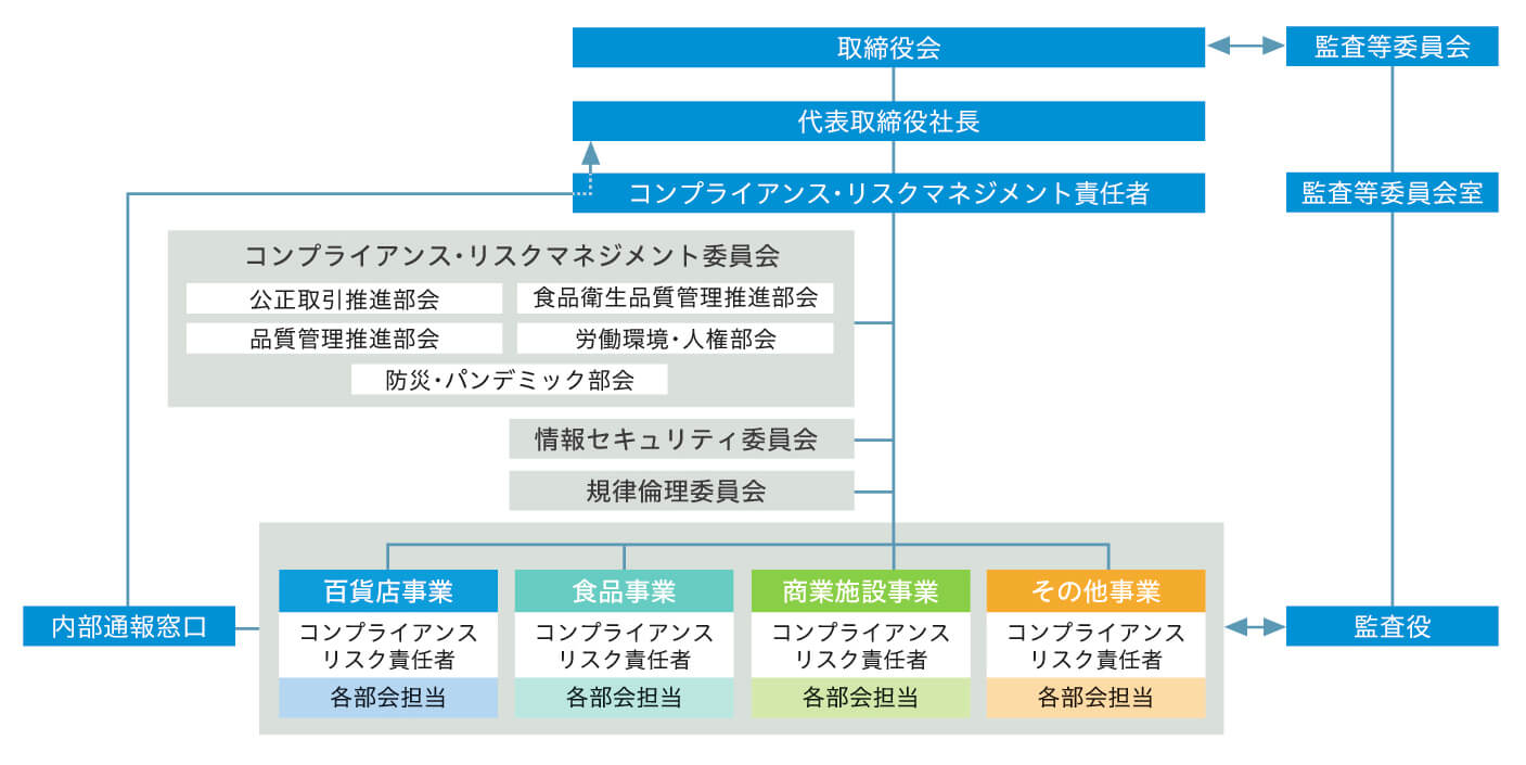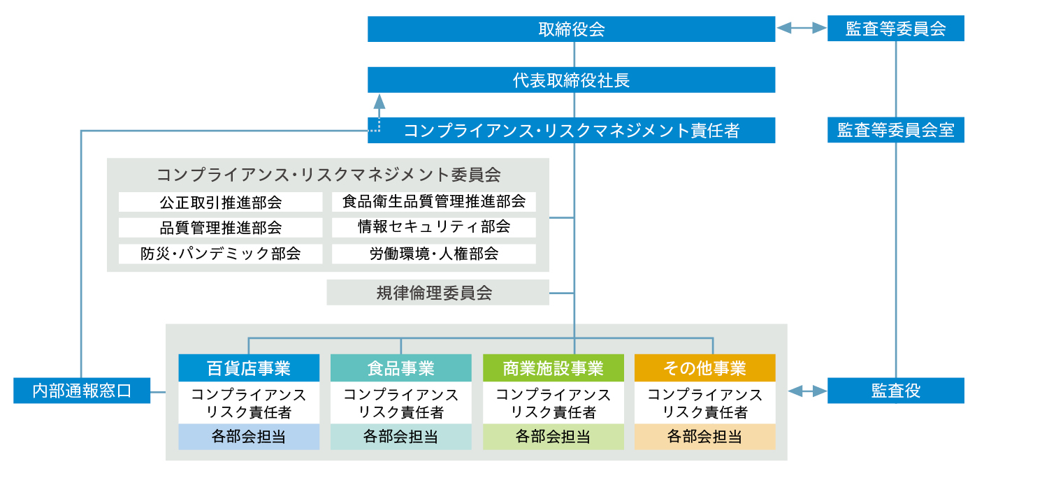 当社では、リスク発生の予防対策、リスク発生時の報告、発生リスクへの対応の原則、対応策の実施などを骨子とする「リスク管理規程」を制定しています。また、コンプライアンス推進に関しては、当社グループの役員及び従業員が当社グループの基本方針、倫理・法令・ルール等に基づき行動するための基本姿勢を「H2Oリテイリンググループ行動規範」として定めるとともに、「グループコンプライアンス規程」を制定し、当社グループのコンプライアンス推進に関する基本方針並びにルールを定めています。