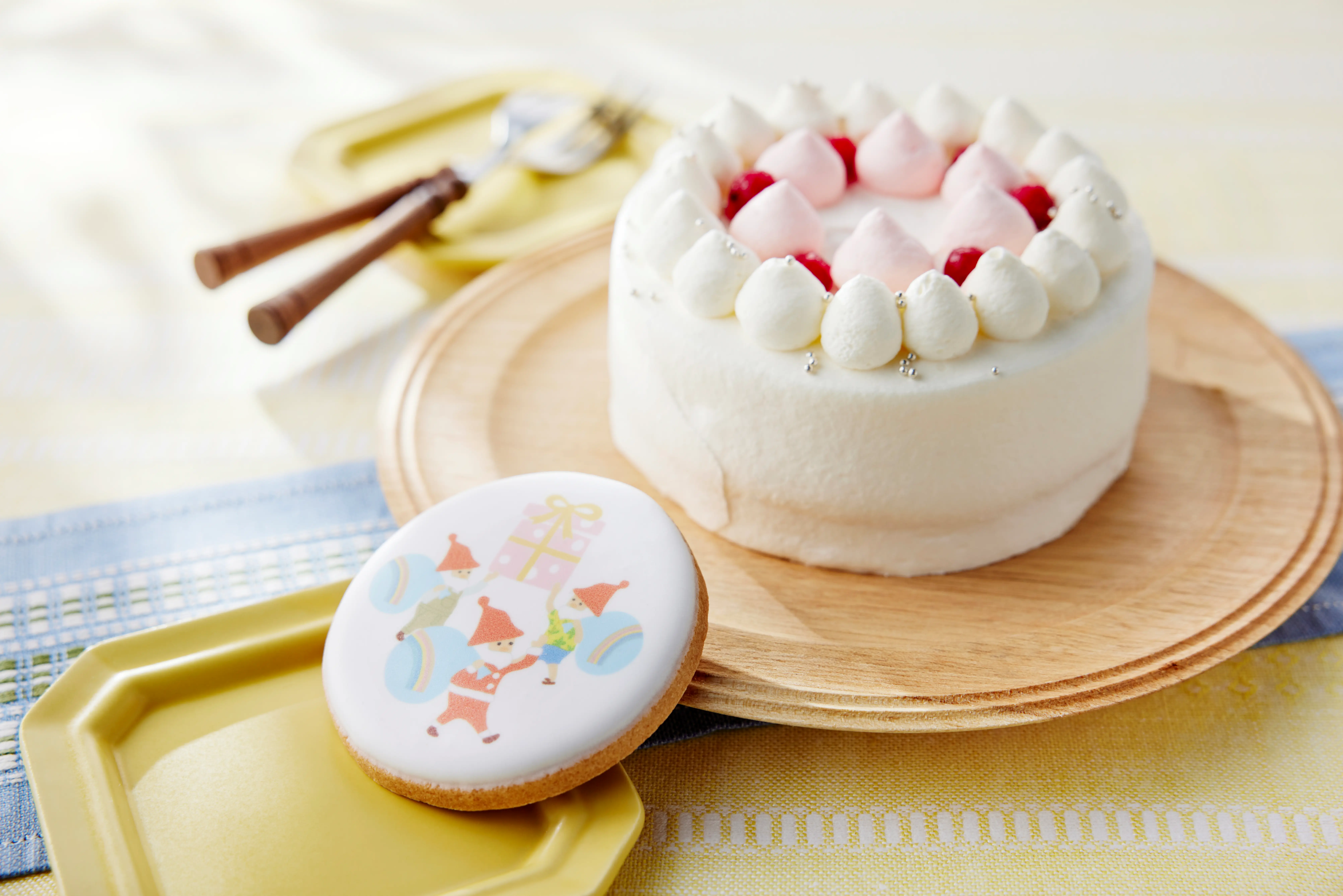 こどもたちに、誰もが想像する定番のケーキを届けることを目指してデザインしたのが、白いデコレーションケーキでした。そして”いつもこどもたちに寄り添っている”ことを表すため、サンタのデザインのアイシングクッキーを添えました。