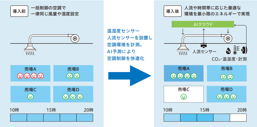 吉原さん:通常、施設空調は、どのフロアでもどの時間帯でも、一律の風量や温度に設定して稼働しています。これだとフロアや時間帯によって、暑すぎたり寒すぎたりということが起こってしまう上に、消費電力にも無駄が生じます。一方AIスマート空調システムは、温度や湿度の変化、人流を計測するセンサーで収集したデータをもとに室温の変化を予測し、フロアや時間帯ごとに風量や送風温度を自動で調整します。そうして快適な室温環境を最小限のエネルギーで実現するものです。これを導入することによって、どのフロアに来店いただいても、快適な温度でお買い物をしていただける環境をご用意しています。