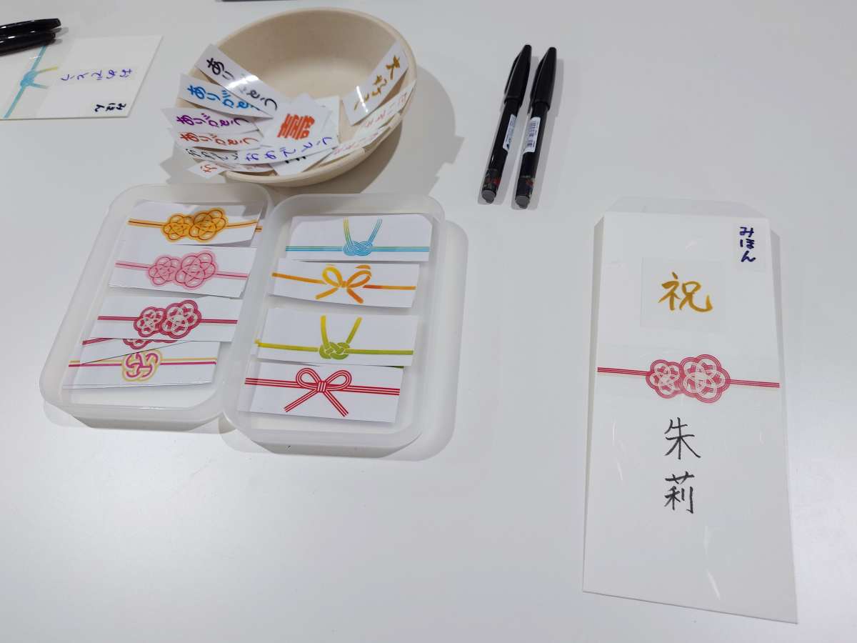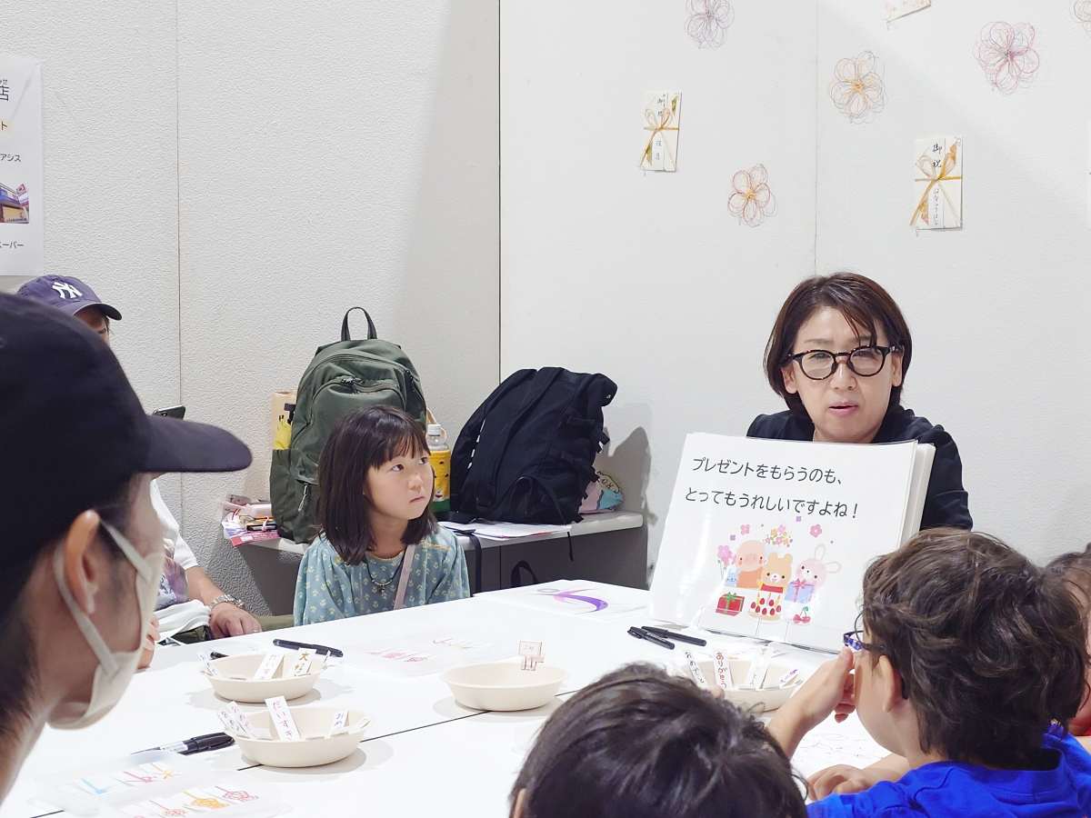 当社はグループの人材派遣会社「阪急ジョブ・エール」の社員が講師を務め、「日本ならではのおもてなし オリジナルのし袋作り」ワークショップを開催しました。紙芝居を用いて、日本には「おめでとう」といった言葉による「心のおもてなし」と贈り物などの 「形で表すおもてなし」で、相手に喜ぶことを考えて行動する慣習があると伝えました。こどもたちは、阪急阪神百貨店でのあいさつやお辞儀を練習し、好きなことばと水引きのシールを選んで、のし袋作りを楽しみました。